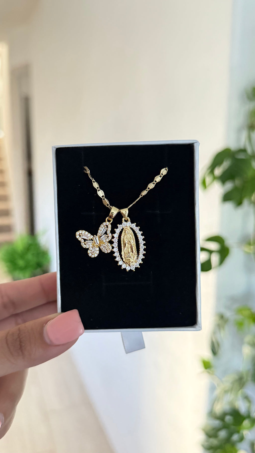 Nuestro Collar Virgencita Lavanda está hecho para brillar. Esta belleza presenta nuestra atemporal cadena de oro gux, una mariposa lavanda junto a la virgencita, lo que la convierte en el complemento perfecto para tu look diario.