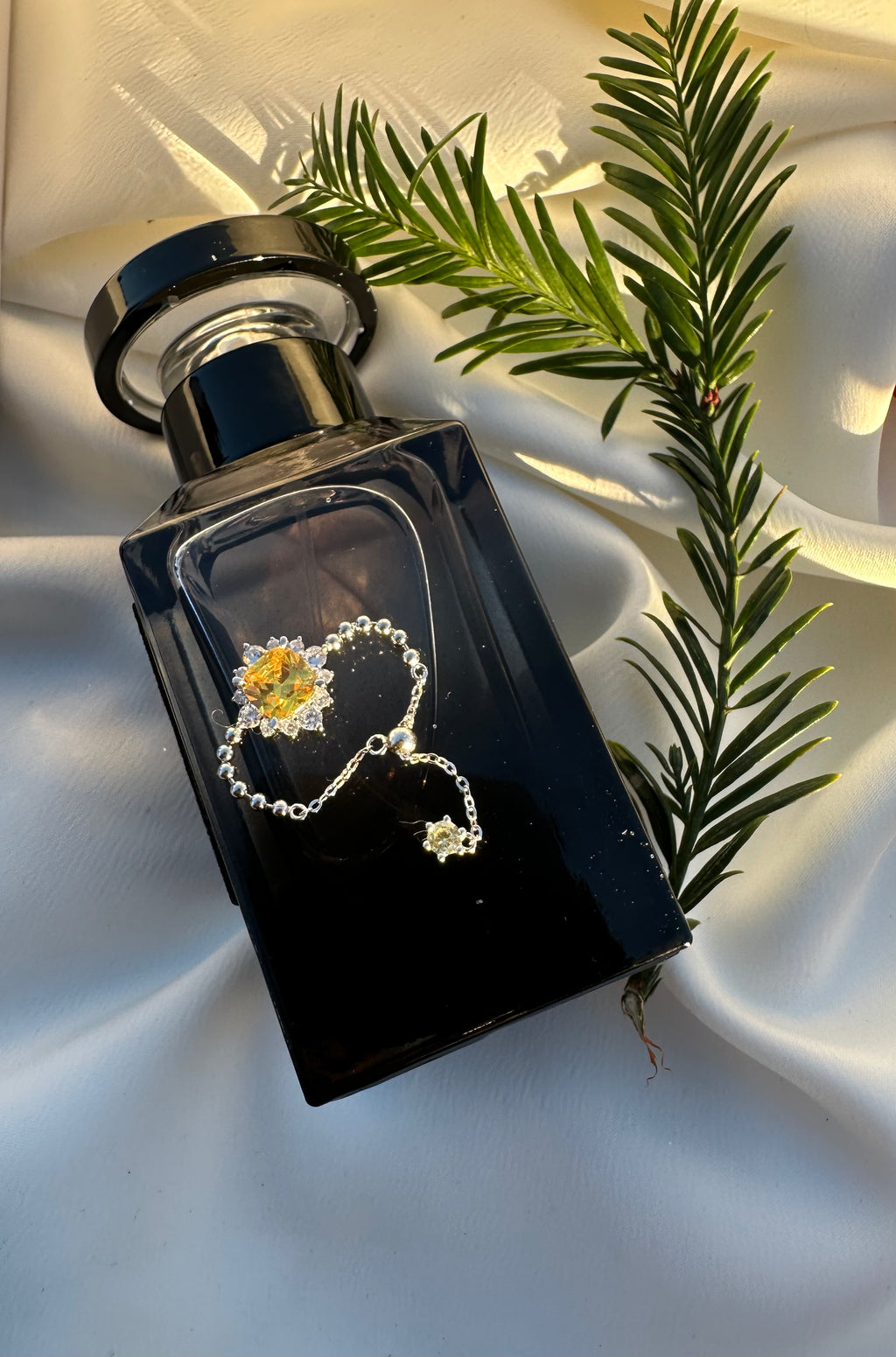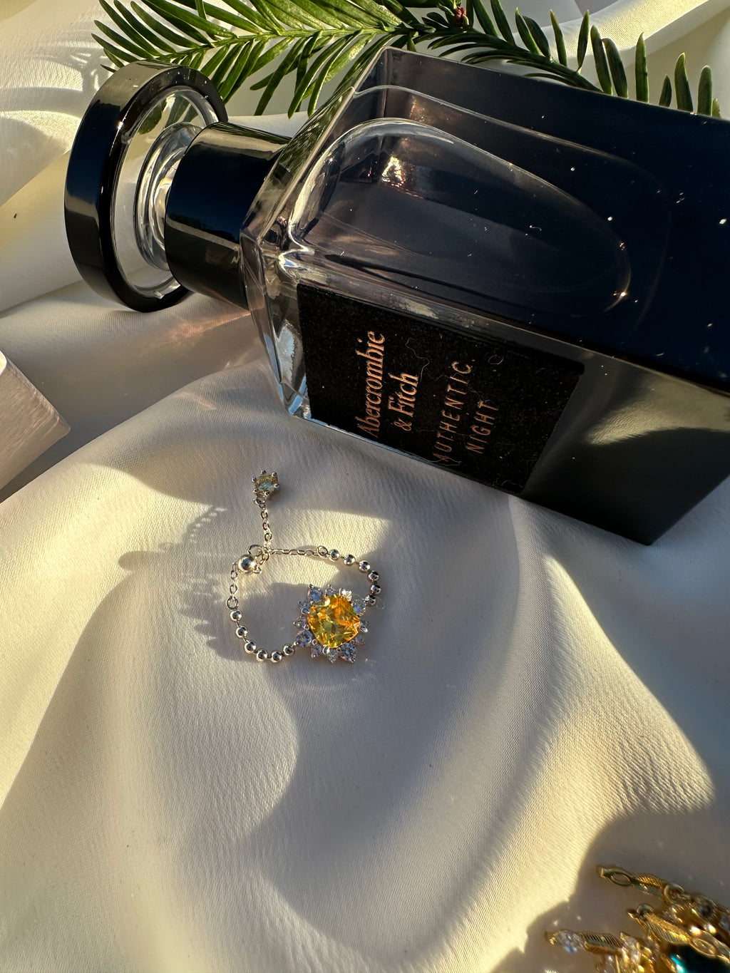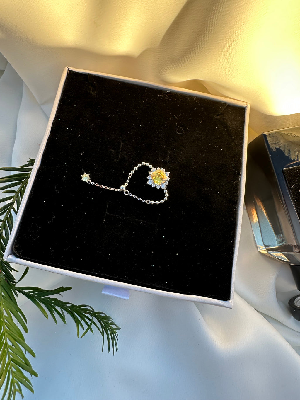 This Adjustable Chain Ring is made with .925 Sterling Silver and features our classic Radiating Yellow sun with a dainty lock to tie the whole look together.