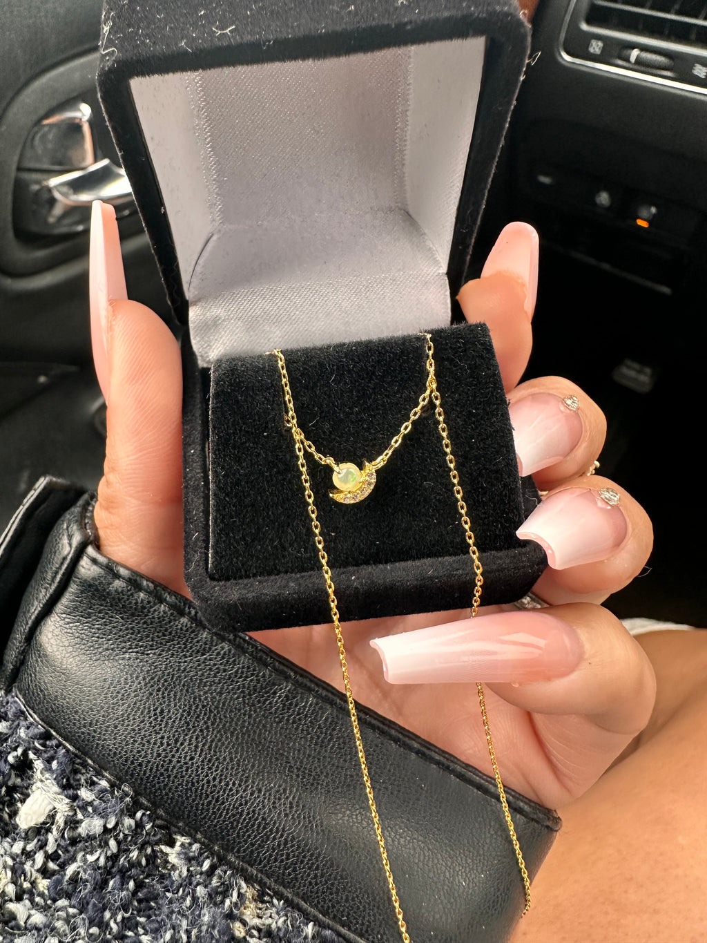 Meet your new favorite dainty necklace — a tiny pop of magic you can wear every day. This piece features a glowing opal-like stone nestled inside a gold crescent moon, finished with sparkly little CZ accents that catch the light just right.