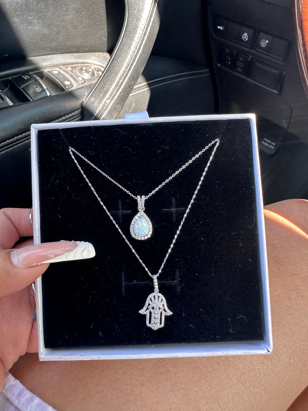 Add a touch of magic to your look with this Sterling Silver Opal Protection Necklace Set. Featuring a dreamy white opal teardrop pendant on an 18-inch chain alongside an 18-inch paved Hamsa charm, these necklaces bring both style and good vibes. Wear them together for double the charm or separately to mix and match your protection game. Perfect for adding sparkle and a sprinkle of positive energy to any outfit!