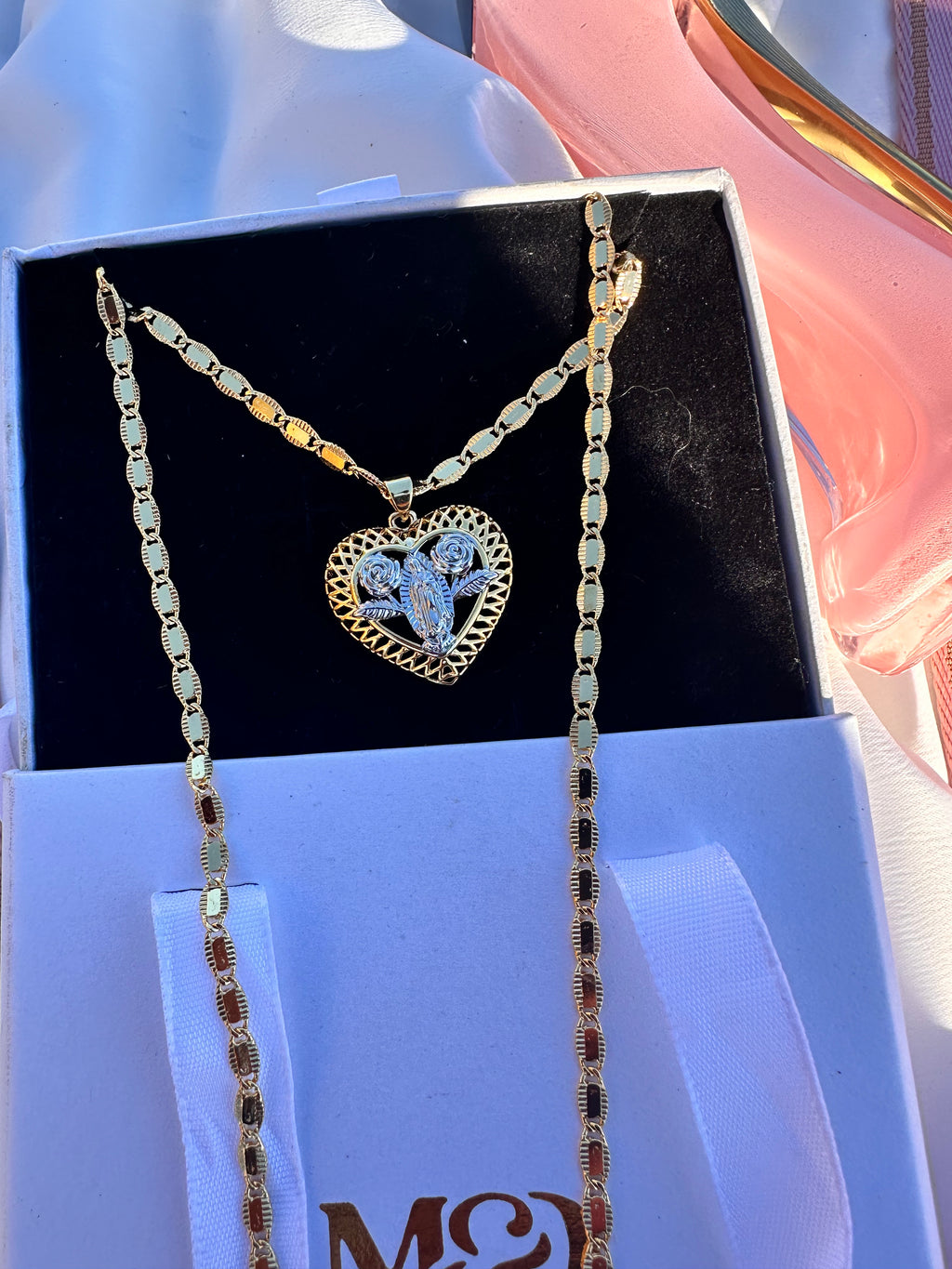 Discover the elegant Virgen Mary Dual Heart Necklace with a 20- inch chain. This stunning piece features dual hearts, symbolizing love and devotion, with a detailed depiction of the Virgin Mary. Perfect for showcasing your faith and style.