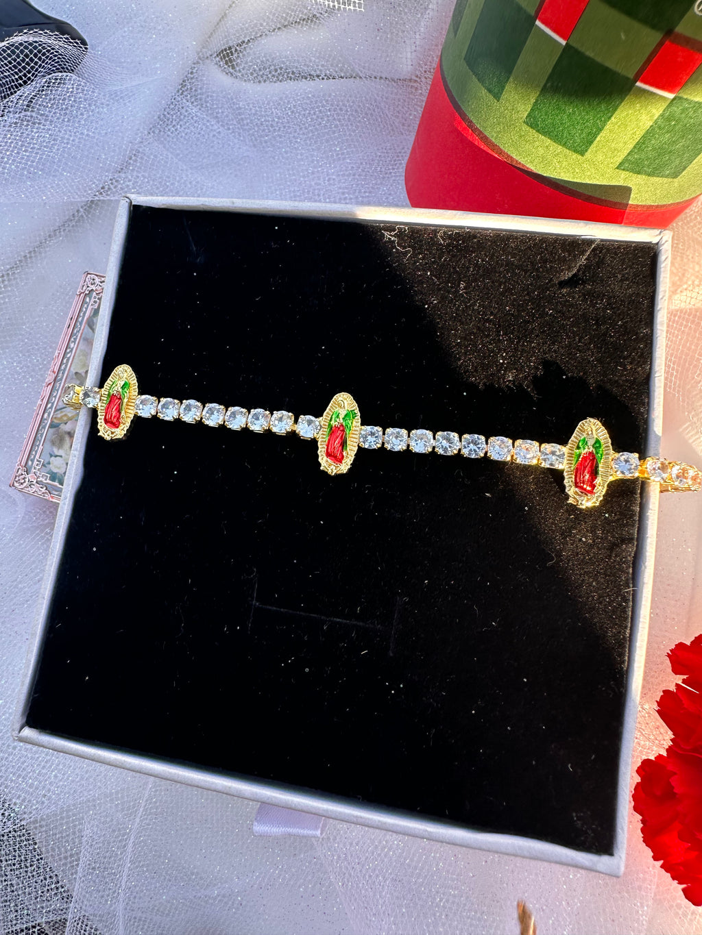 Embrace purity, protection, and spiritual grace with this elegant white tennis bracelet featuring a Virgin Mary centerpiece. The pristine white stones symbolize clarity, positivity, and light, while the Virgin Mary brings blessings, guidance, and protection. Perfect as a meaningful talisman for everyday wear or layering with your favorite pieces. Length: 7 inches + 2 inch extender