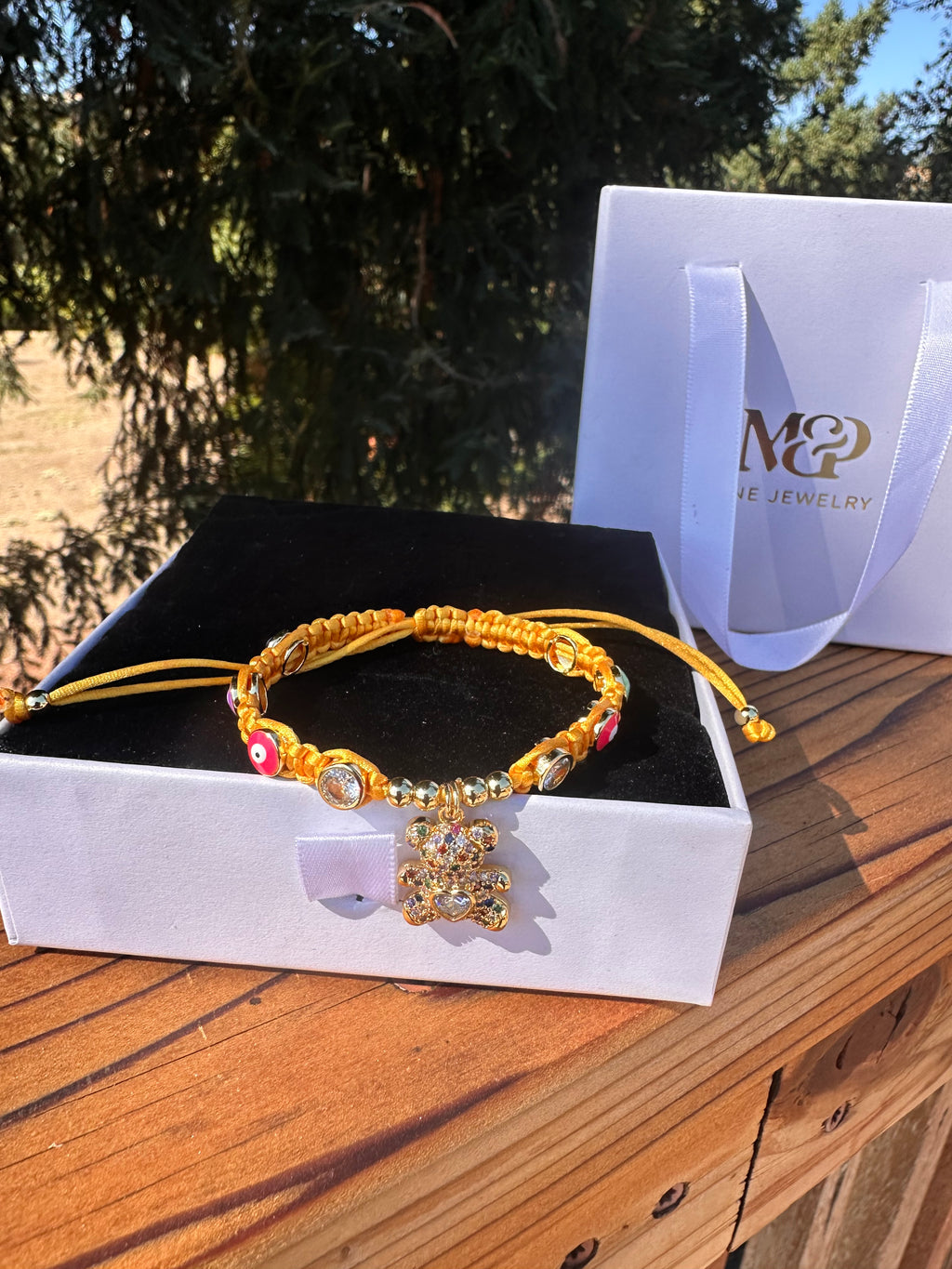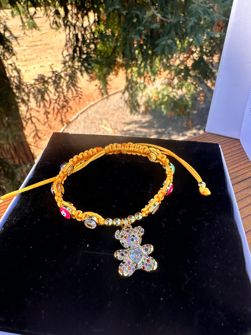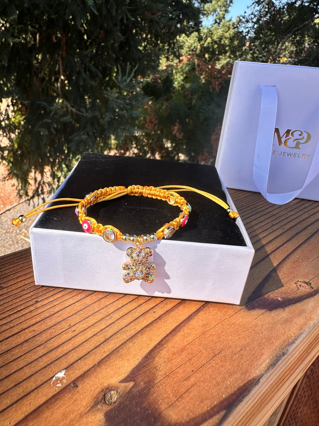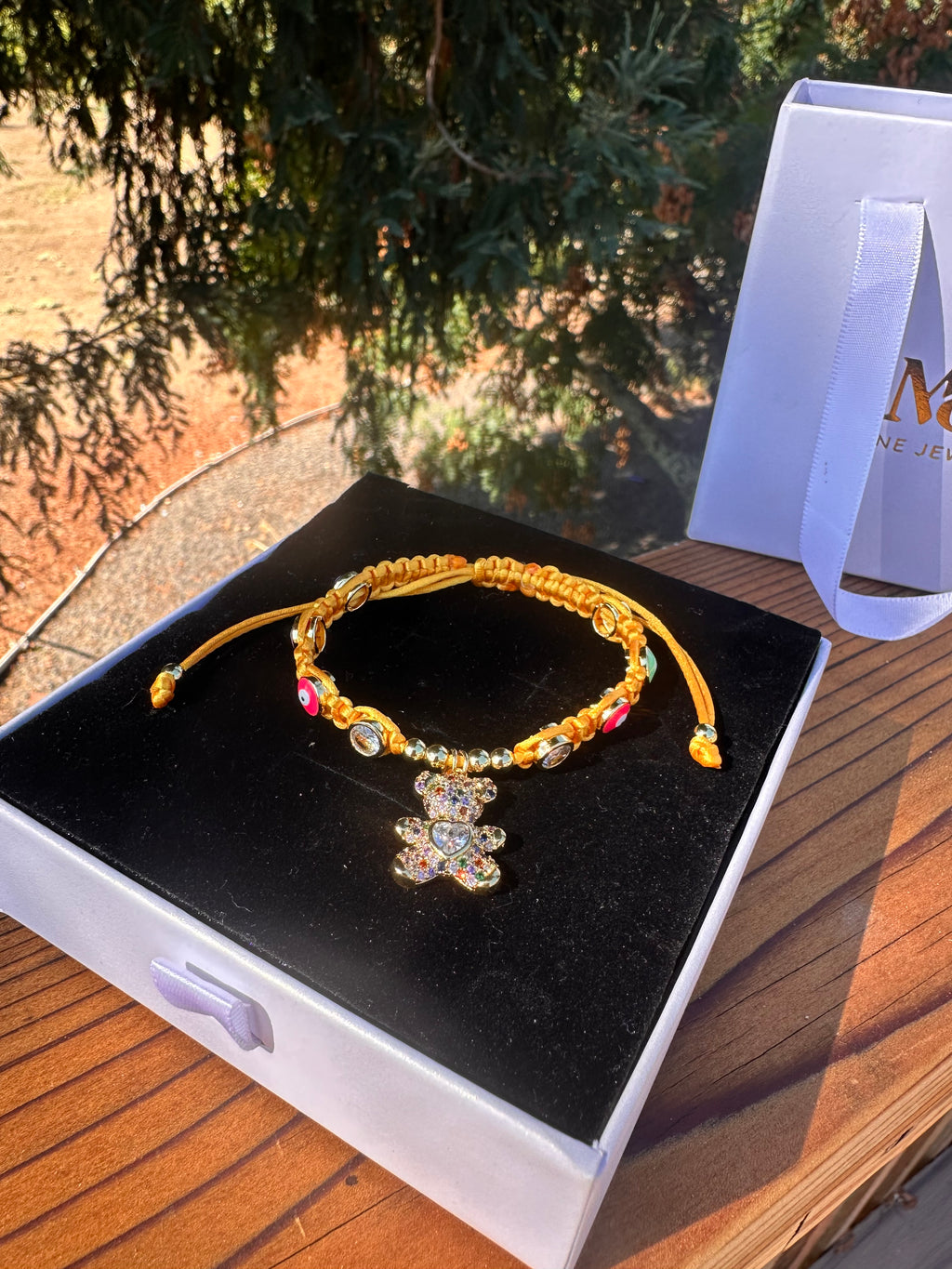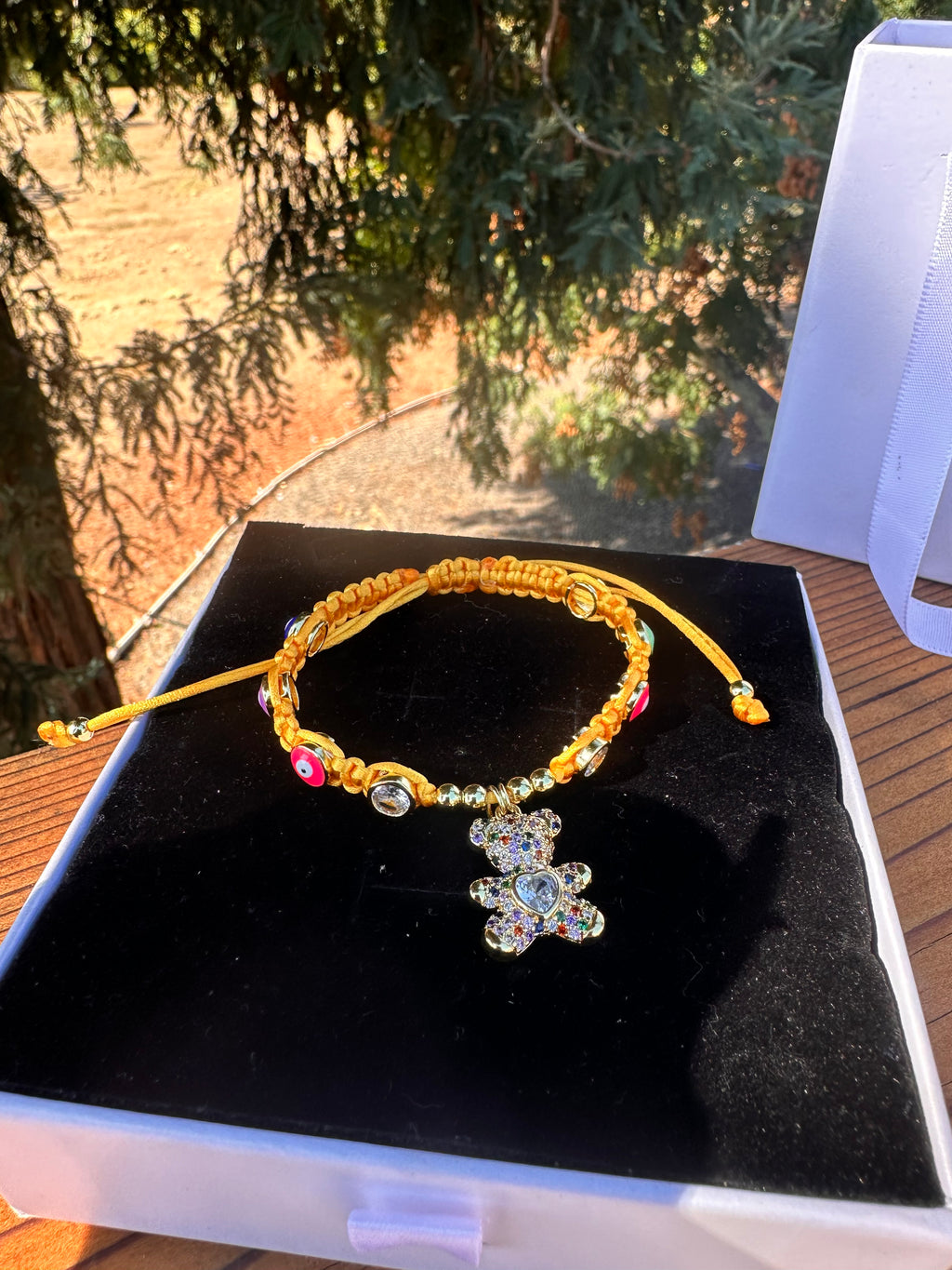 Una pieza llena de cariño y protección: un tierno osito acompañado de un ojo turco lateral para alejar las malas vibras, adornado con un girasol amarillo que irradia alegría y buena energía. Ajustable y perfecta para regalar o llevar todos los días, hecha con amor para ti.