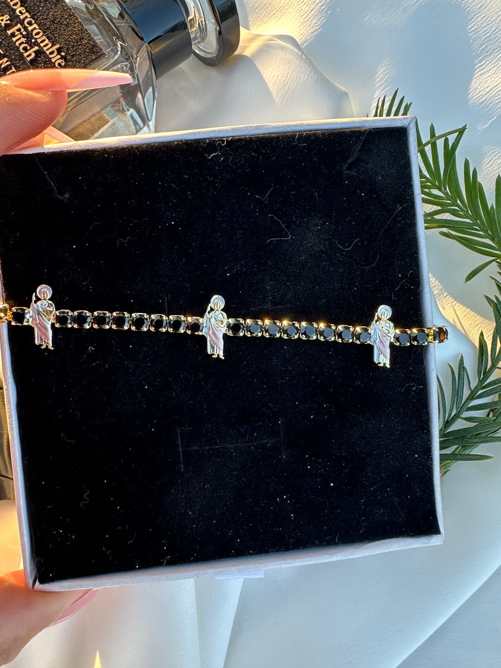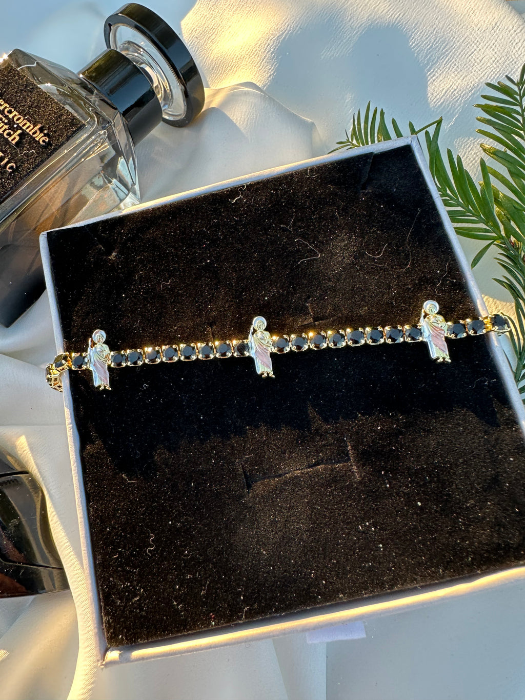 A striking black tennis bracelet featuring delicate Saint Jude charms framed by elegant rosary-inspired links. This piece serves as a talisman of hope, protection, and perseverance, blending spiritual meaning with contemporary, edgy style—perfect for daily wear or layering with other jewelry.