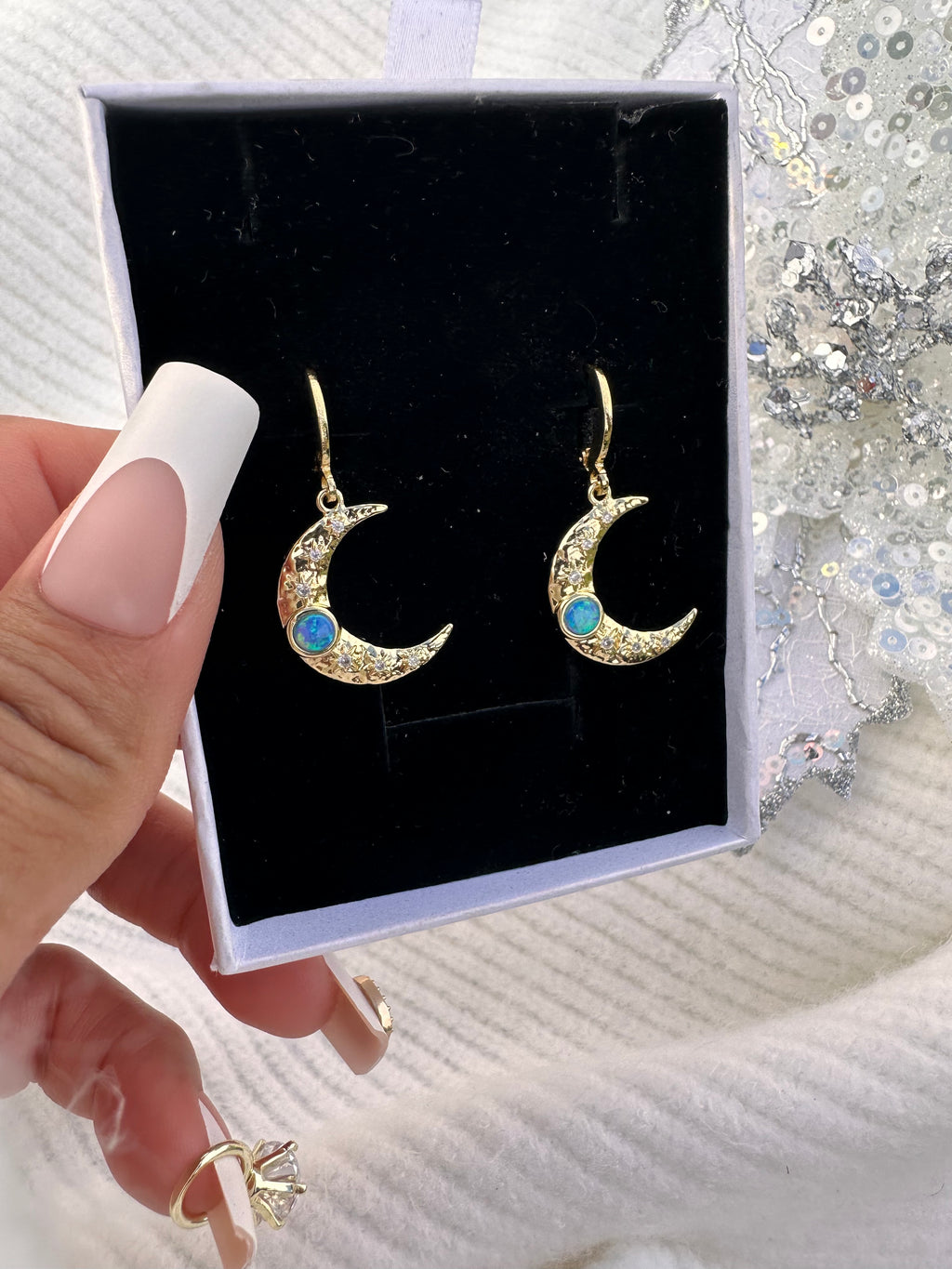 These elegant gold crescent earrings sparkle with tiny crystals and a captivating blue gemstone — a symbol of intuition, femininity, and light in the darkness. Perfect for dreamers, believers, and lovers of the night sky.