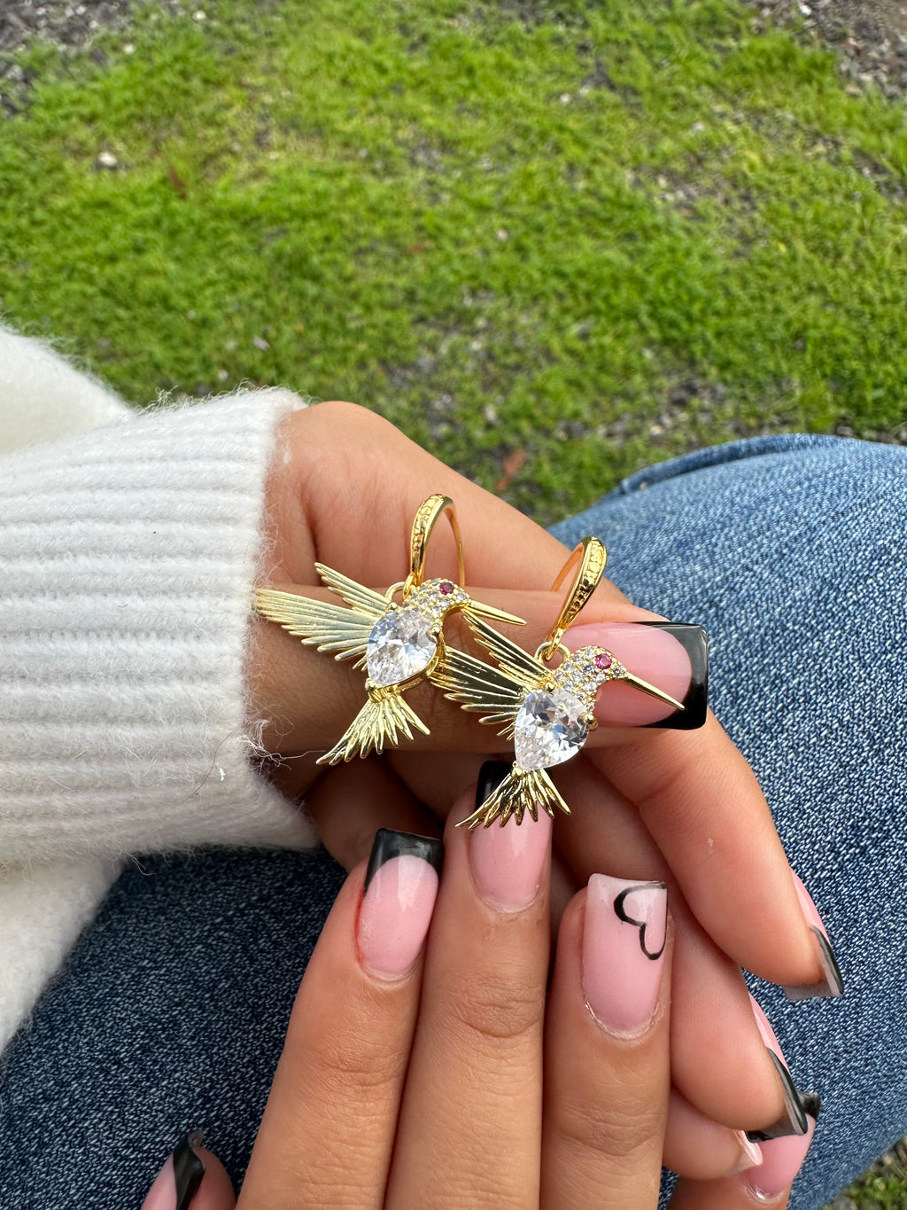 Delicate and captivating, these earrings capture the grace and elegance of a hummingbird in mid-flight. Each piece is meticulously crafted to reflect light with every movement, creating a subtle sparkle that enhances your natural elegance. Perfect for sophisticated evenings, special occasions, or adding a touch of refined charm to your everyday look, these earrings are a timeless statement of beauty and poise.