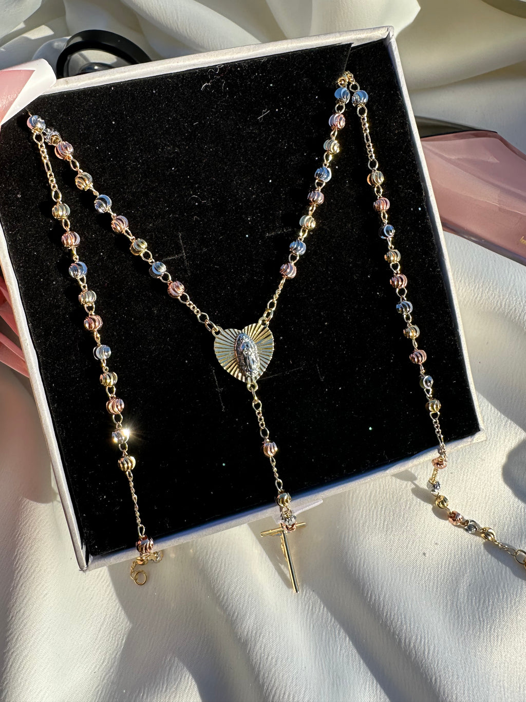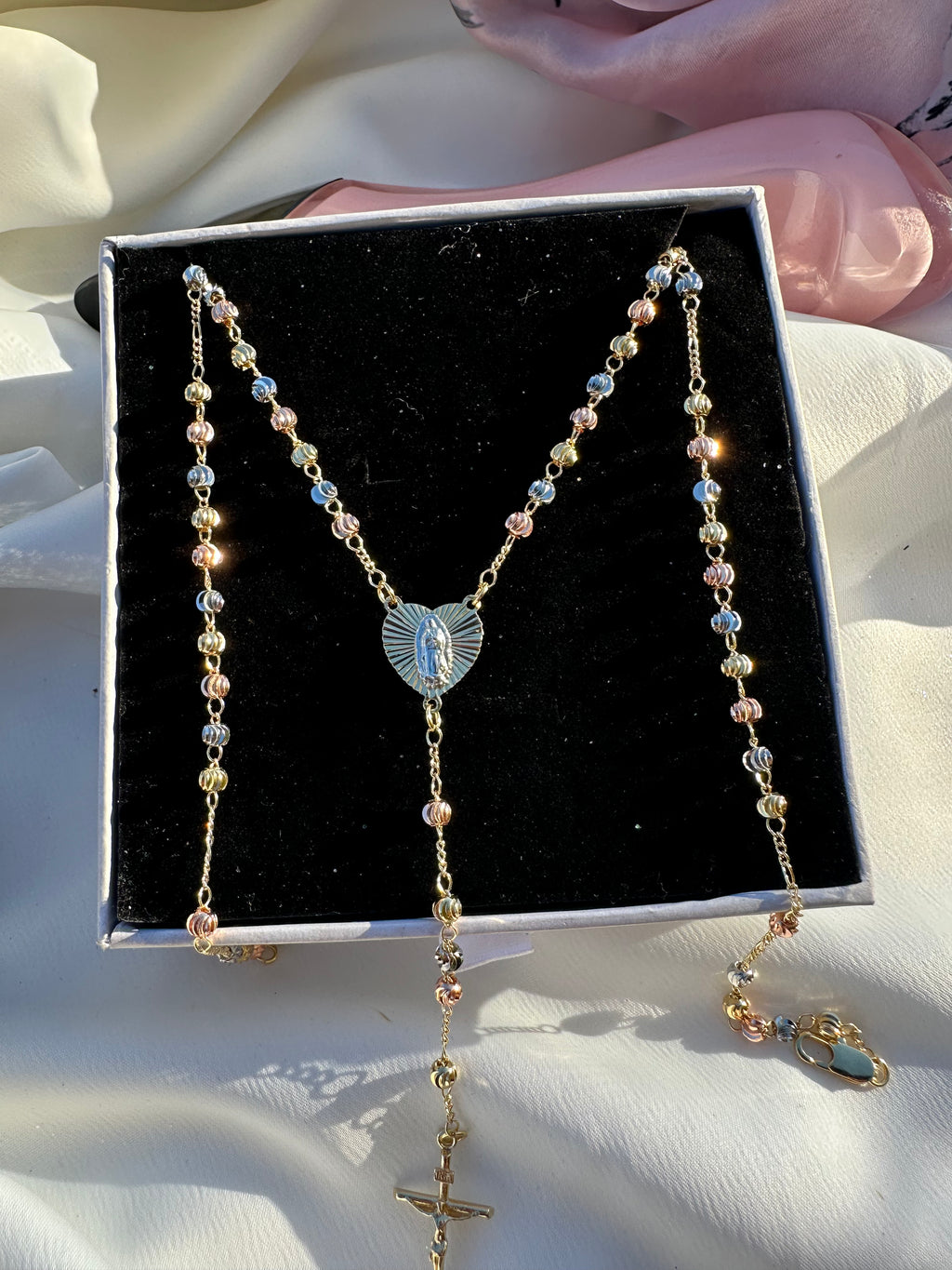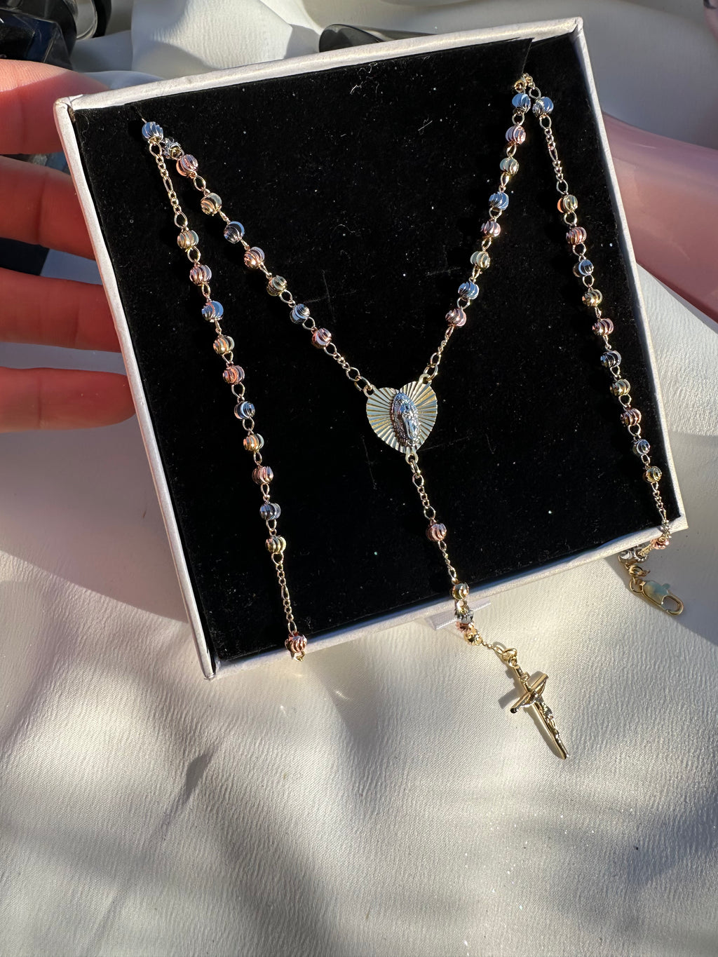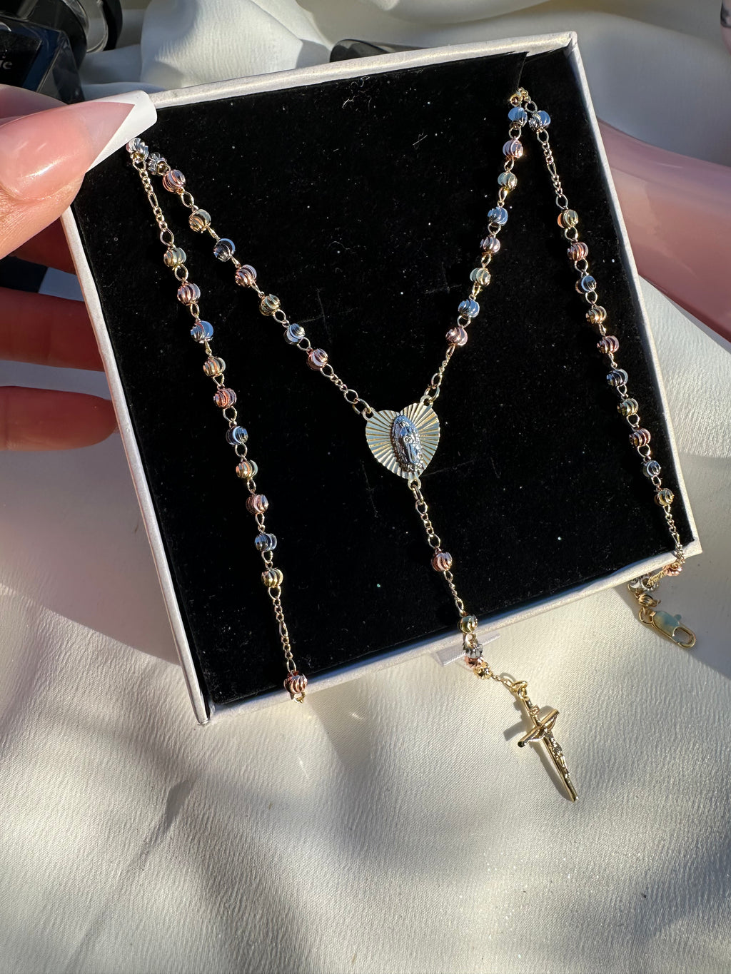 This 20" tri-gold rosary necklace features a radiant heart-shaped Virgin Mary centerpiece that glows with divine warmth, leading to a beautifully hanging crucifix. The blend of gold tones creates a soft, heavenly shimmer, making this piece a powerful talisman of protection, devotion, and spiritual elegance. Designed for those who carry faith like light—close, constant, and beautifully seen.