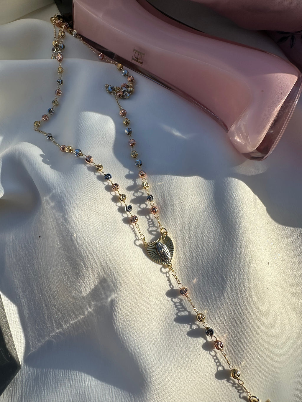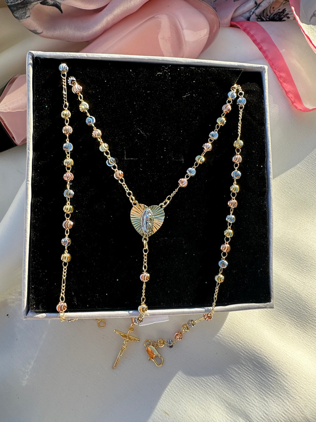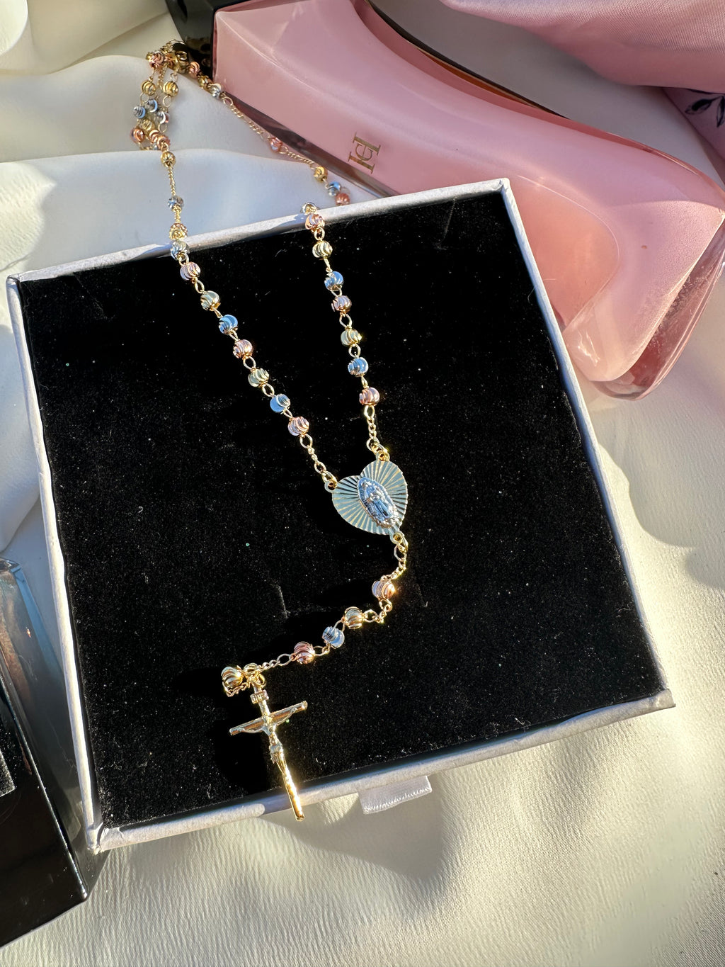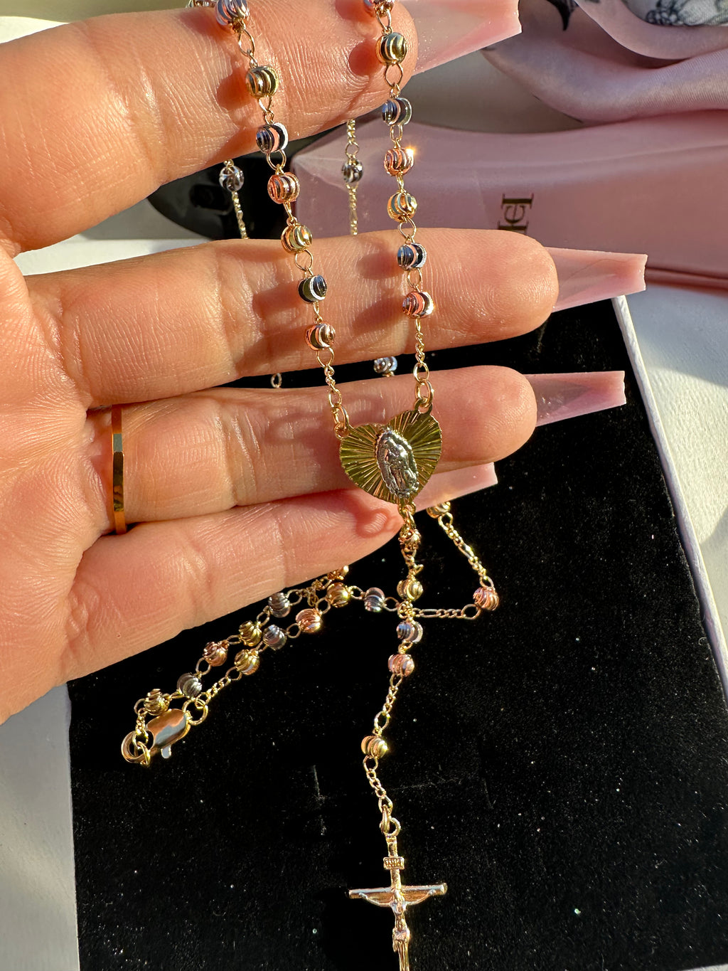This 20" tri-gold rosary necklace features a radiant heart-shaped Virgin Mary centerpiece that glows with divine warmth, leading to a beautifully hanging crucifix. The blend of gold tones creates a soft, heavenly shimmer, making this piece a powerful talisman of protection, devotion, and spiritual elegance. Designed for those who carry faith like light—close, constant, and beautifully seen.