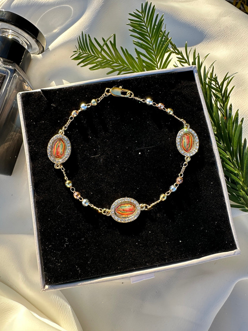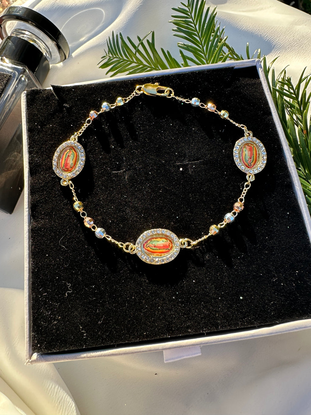 A 7-inch rosary-style bracelet adorned with vibrant, colorful Virgin Mary images that glow with spiritual energy. Each charm carries its own blessing, creating a trio of protection, guidance, and divine comfort. Paired with delicate rosary beads, this piece feels like a wearable prayer—soft, sacred, and full of meaning.