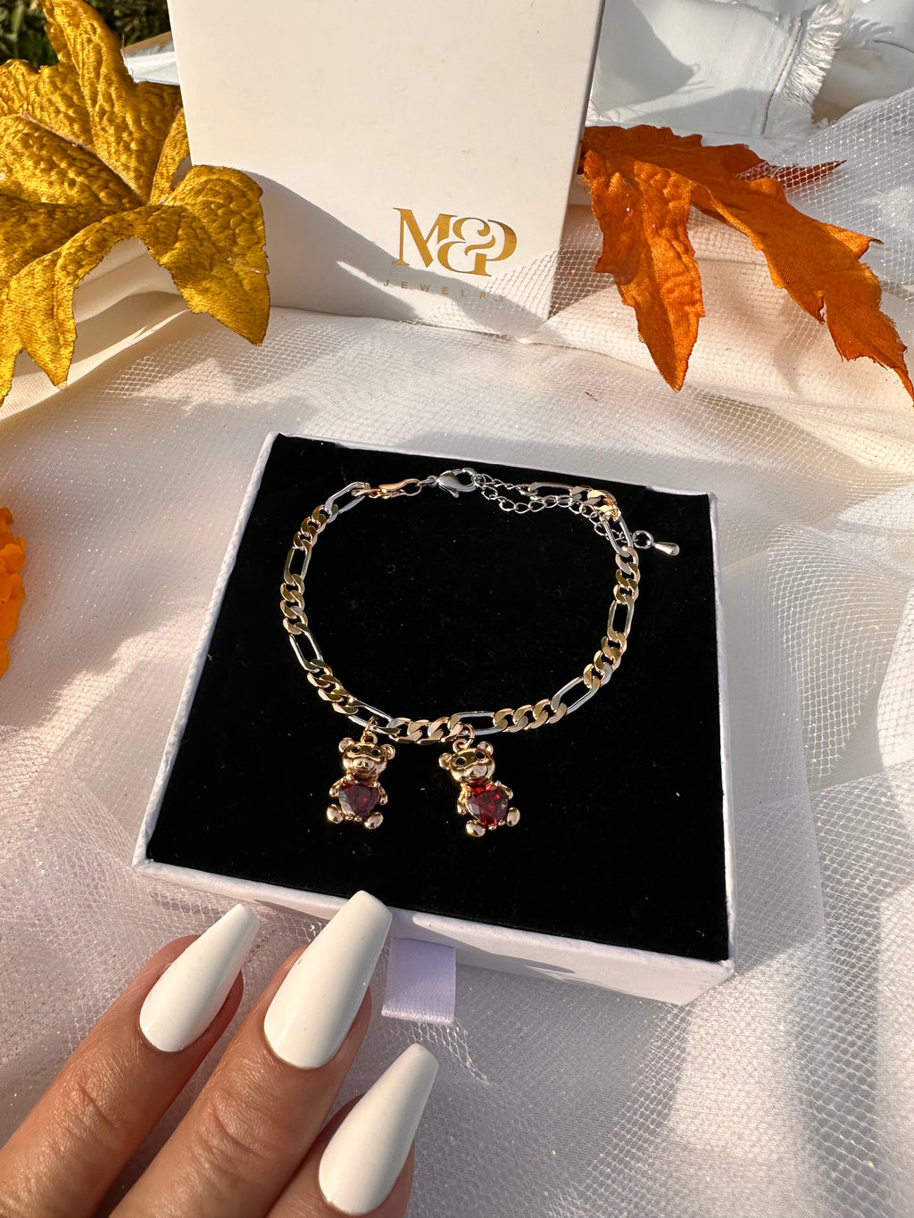This adorable duo-tone Figaro bracelet features two little teddy bears linked at the center, each holding a tiny red heart—symbolizing love, comfort, and sweetness. The mixed-metal chain brings a stylish contrast, making it easy to pair with gold, silver, or everyday jewelry.