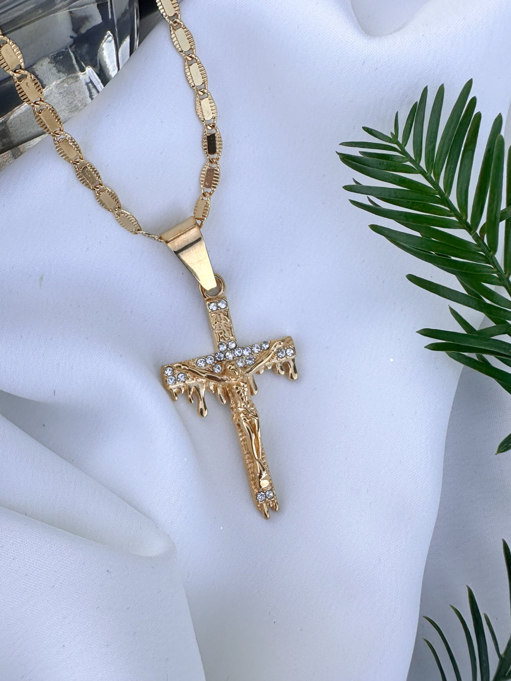Celebrate faith with a touch of sparkle and femininity. This 20-inch gold cross necklace features Jesus at the center, a half-paved design, and a soft “melting” detail for a modern, delicate look. Perfect for layering with dainty chains or wearing alone, it’s a chic, meaningful accessory that blends spirituality with girly elegance.