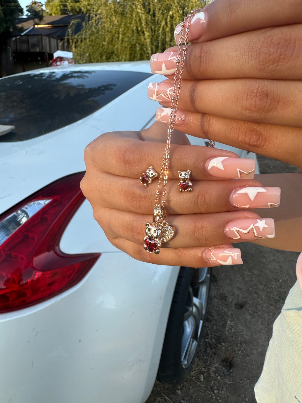 Pendant necklace – matching teddy bear with a deep-red crystal center and a pavé crystal heart charm on a delicate chain.