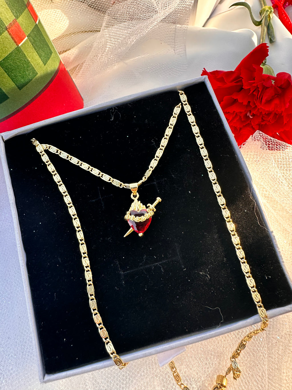 A bold statement of love and strength, the Heart-Pierced Necklace features a radiant heart accented with a sleek sword motif, symbolizing passion, courage, and unbreakable devotion. Crafted in 14K gold plating and paired with a 19-inch chain, it sits perfectly at the collarbone for a striking everyday look.