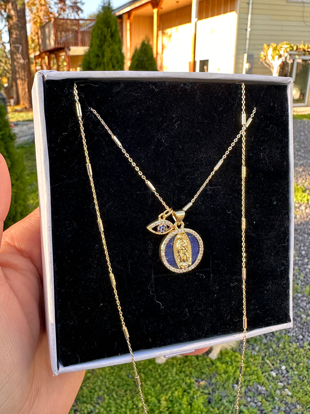 Carry faith and protection in one beautiful piece with this 21-inch necklace featuring a navy blue Virgin Mary pendant paired with a tiny evil eye charm. The deep blue tones add a rich, elegant touch while the evil eye symbolizes guidance and spiritual shielding. Perfect for everyday wear or layering, this necklace blends meaning, style, and modern spirituality in a dainty, eye-catching design.