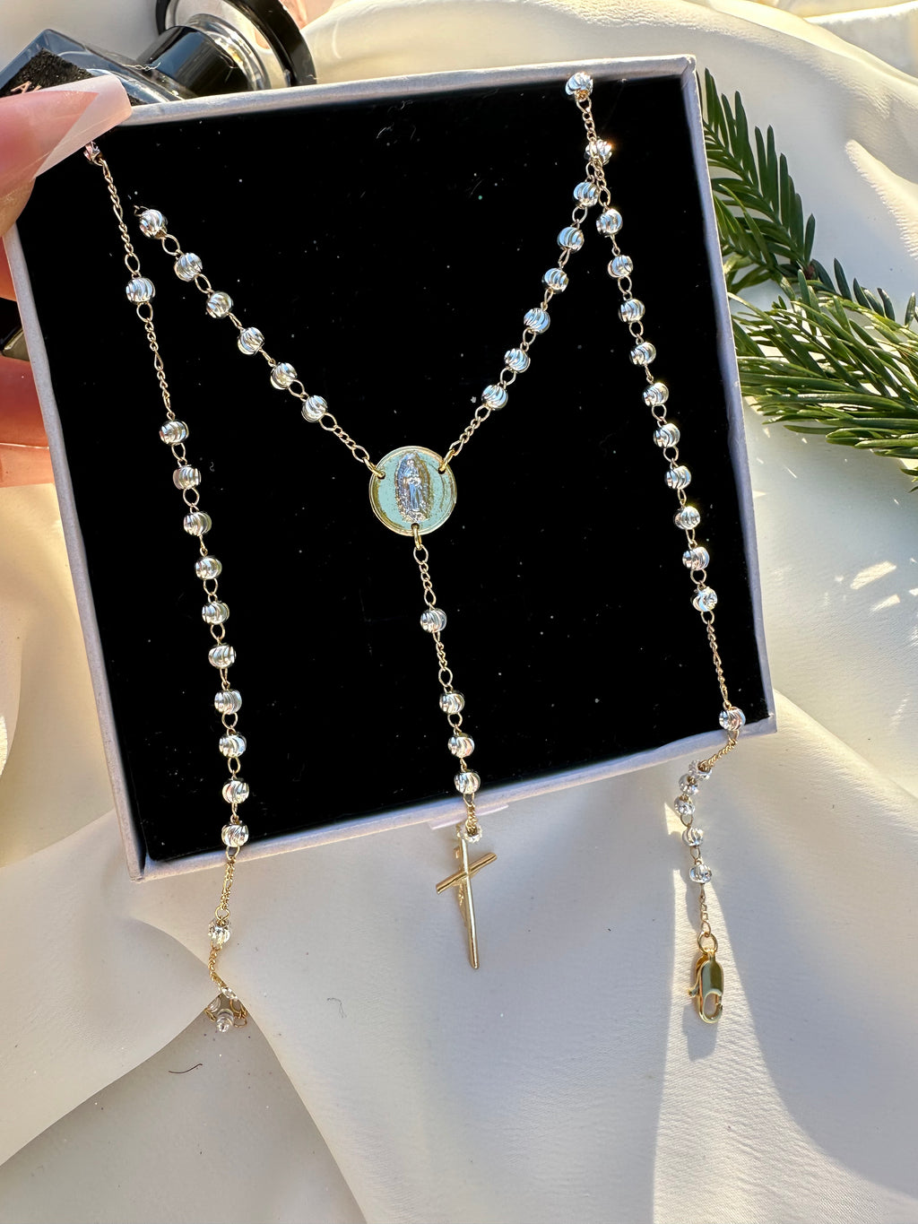 A 20-inch gold rosary featuring a radiant circular Virgin Mary centerpiece paired with a detailed hanging crucifix. This piece carries gentle protection, spiritual clarity, and divine guidance—making it a timeless talisman for everyday faith and elegance.