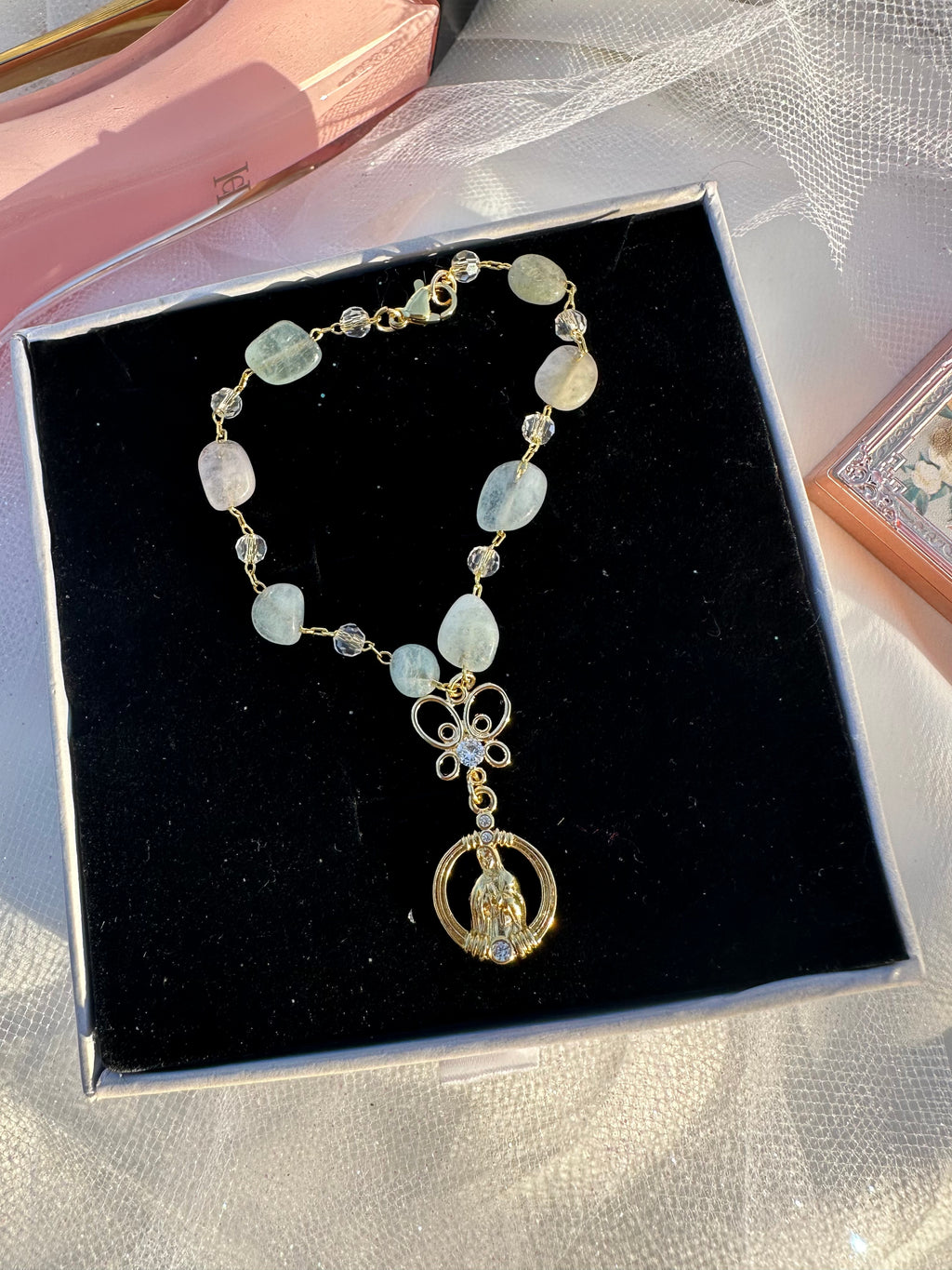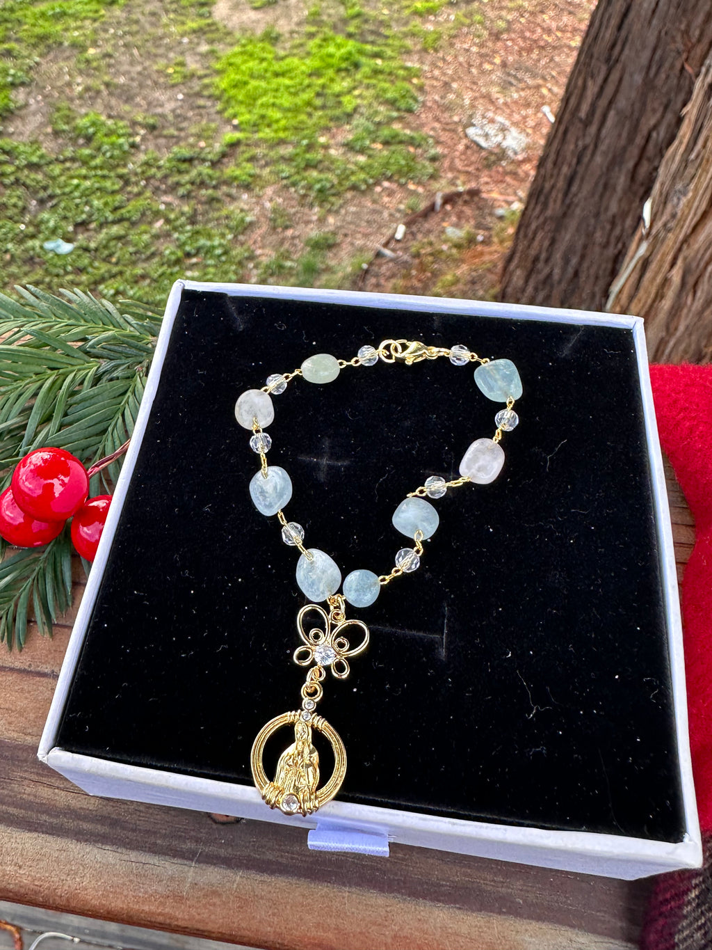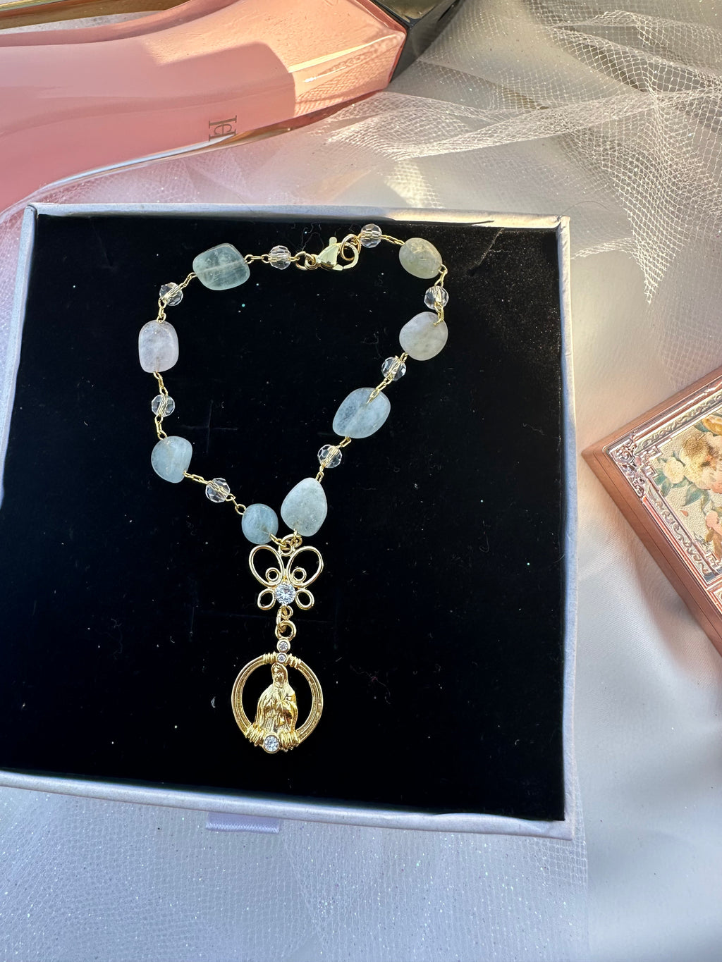 Bring a sense of peace and protection to every drive with this beautifully crafted Mini Virgin Mary Car Rosario, designed to fit perfectly around your steering wheel column.
