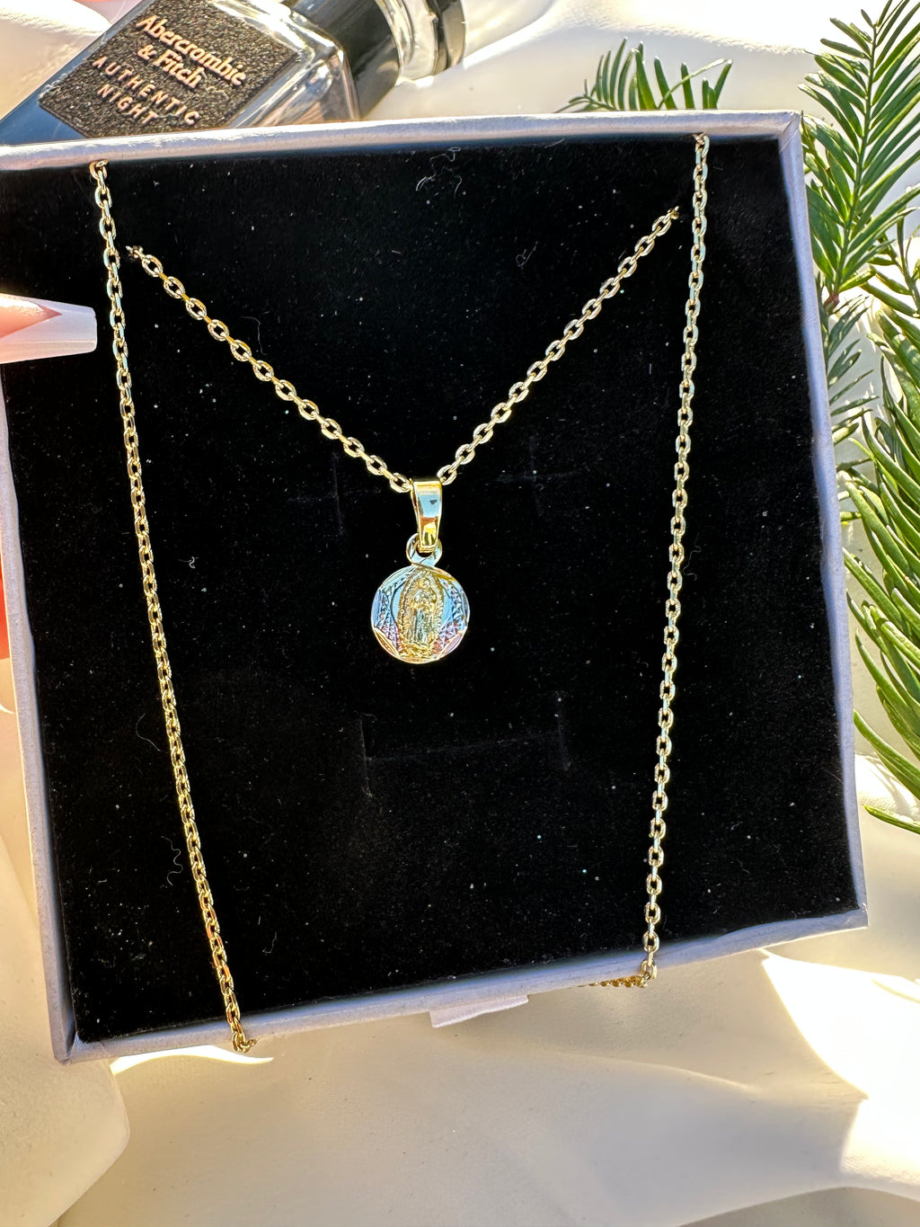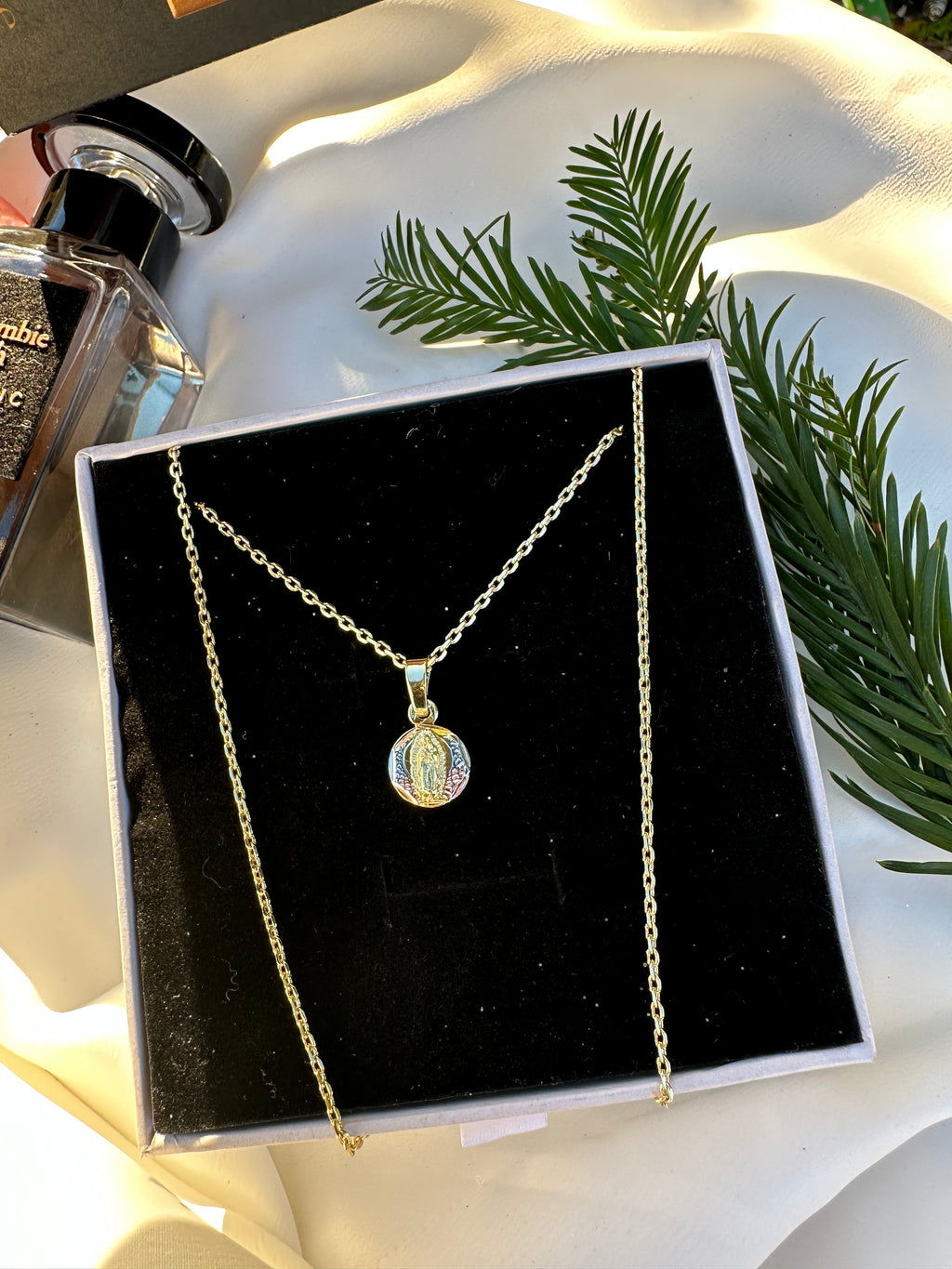 Carry devotion and elegance wherever you go with this delicate Virgin Circle Heart Necklace. Its timeless design features a heart pendant with the iconic image of the Virgin Mary, making it a meaningful statement piece. 18 inches, gold filled