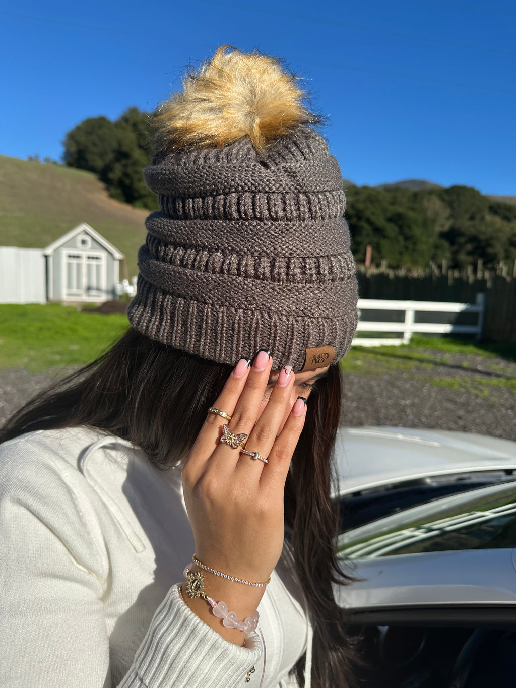 A cozy, slouchy fit brings a cool vibe to this cable-knit beanie from M&P, designed with a faux-fur pom pom to top it off.